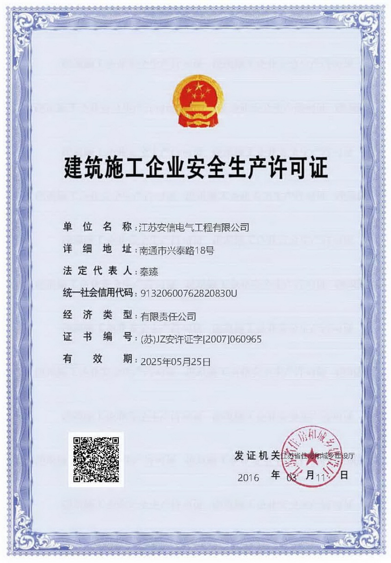 在創(chuàng)業(yè)之初,公司就堅持高起點的戰(zhàn)略思路,廣納賢才,集聚行業(yè)精英,創(chuàng)新發(fā)展,做優(yōu)企業(yè)品牌。現已取得:承裝二級、承修二級、承試二級,電力工程施工總承包二級,輸變電工程專業(yè)承包二級,建筑工程施工總承包二級,建筑機電安裝專業(yè)承包二級,地基基礎專業(yè)承包二級資質證書,并通過了質量、環(huán)境、職業(yè)健康和安全管理體系認證,確保各項工作有序管控。
